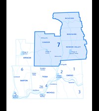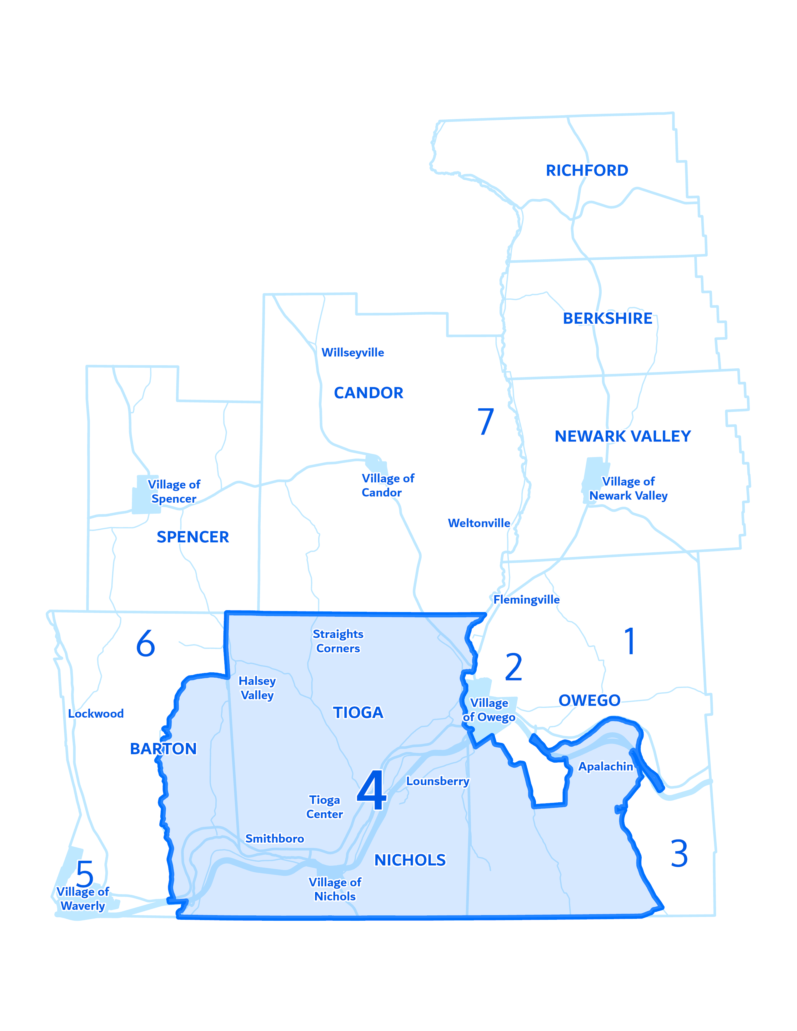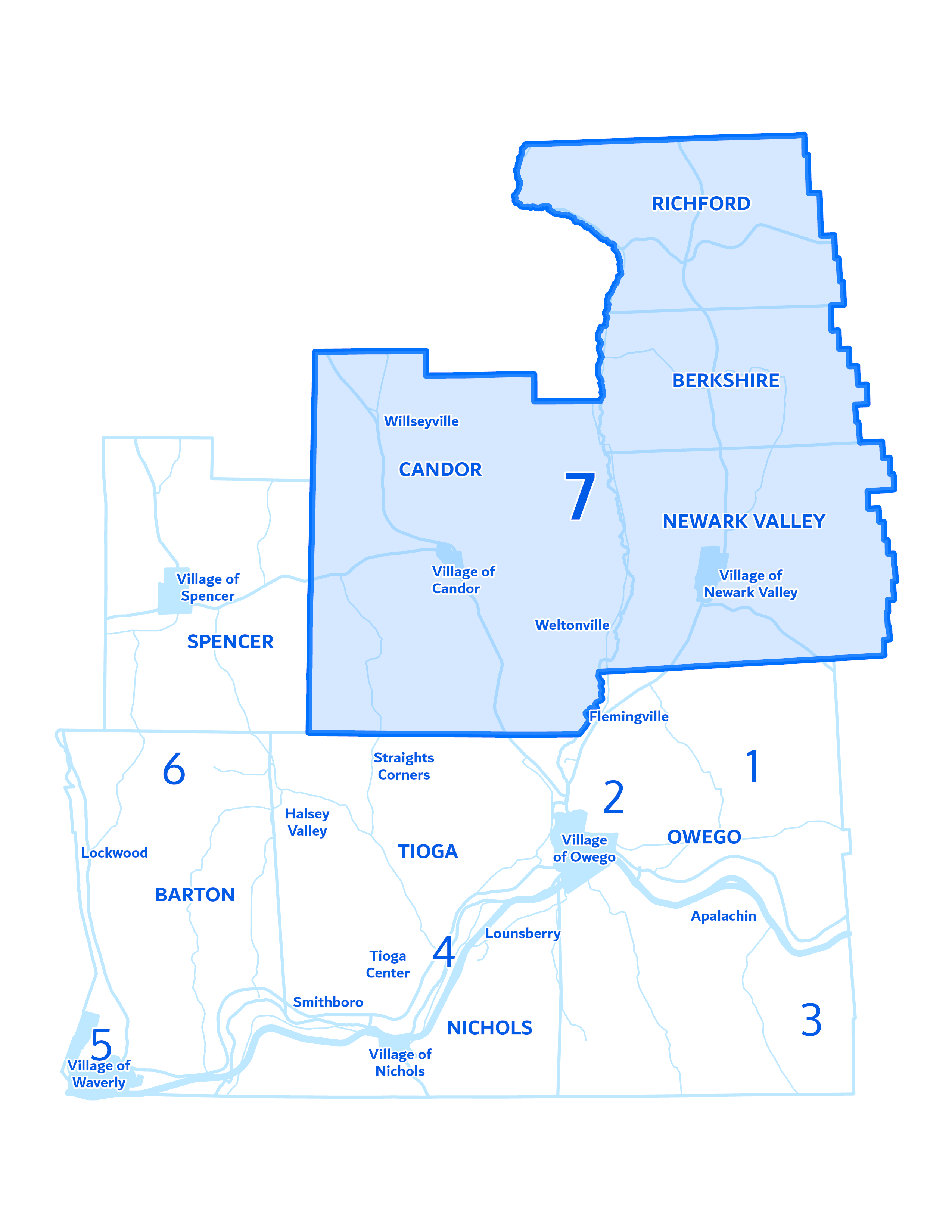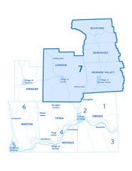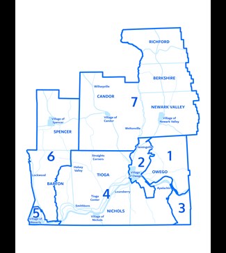 Tioga County is divided into seven legislative districts. Two of those districts, 4 and 7, elect two legislators. The boundaries and configuration of the districts are updated after each decennial census. This general map shows the overview of all 7 districts. Please note that while this map is accurate it is not suitable for precise location of district boundaries due to its small size. To find that information, you may look up the legislative district of any address in Tioga County by using the GIS web app.