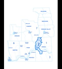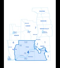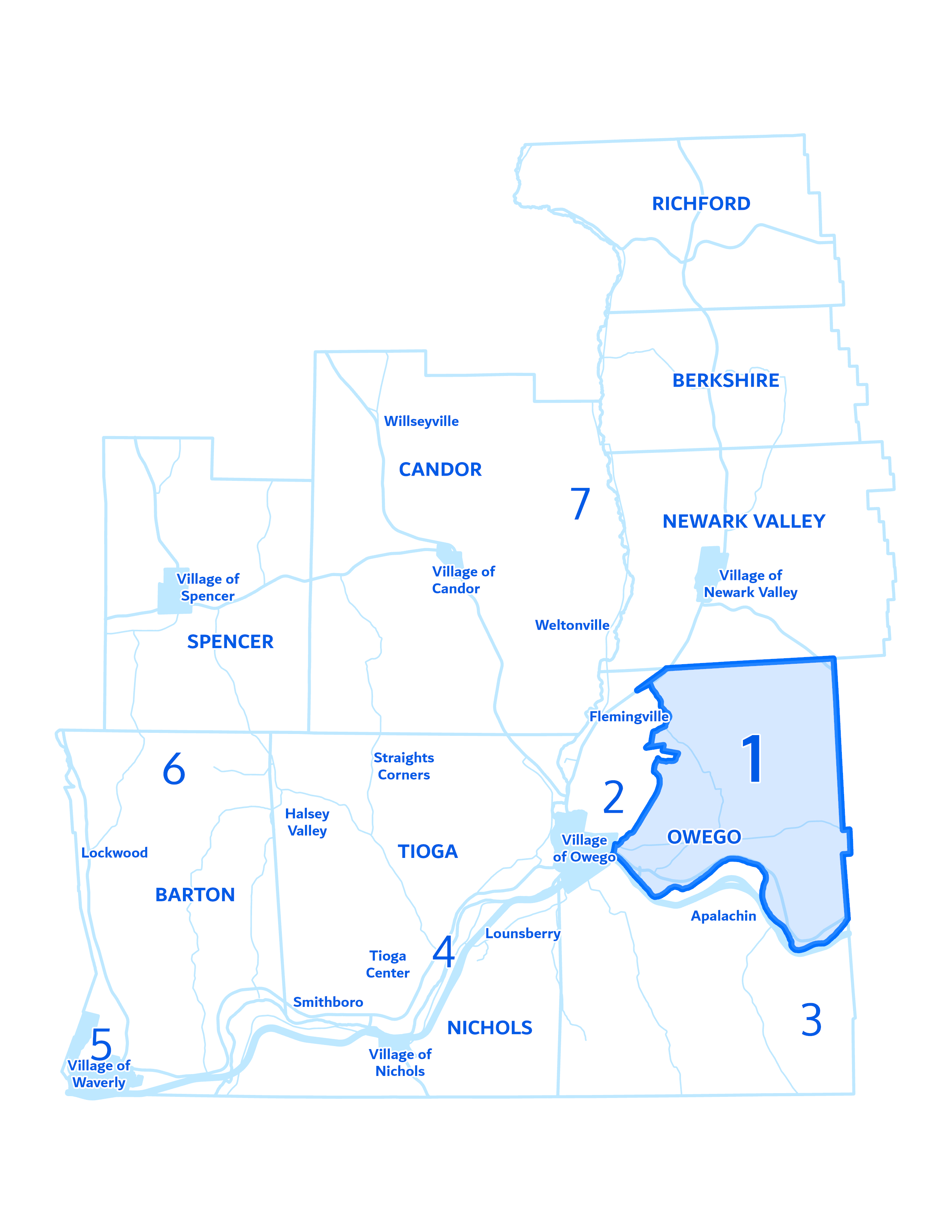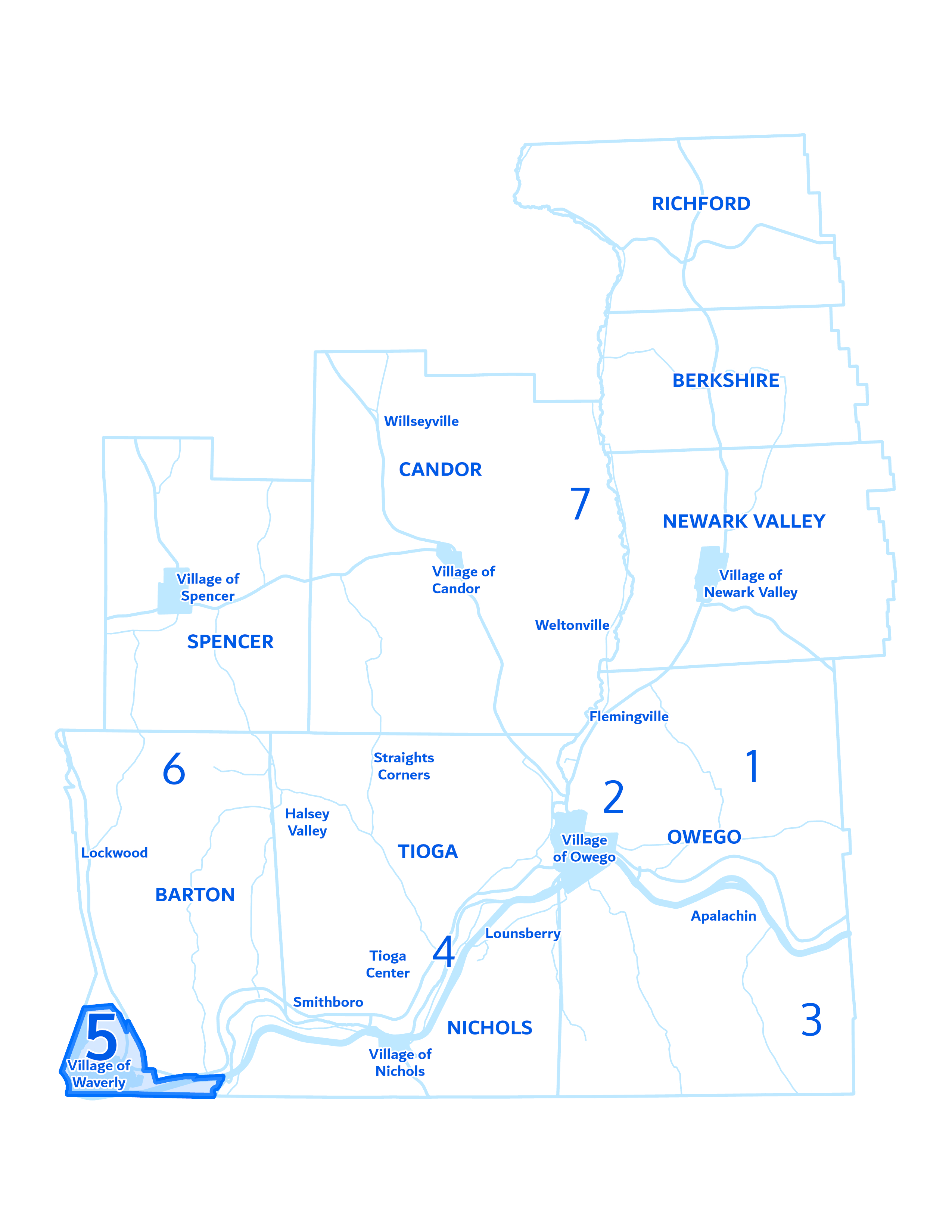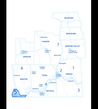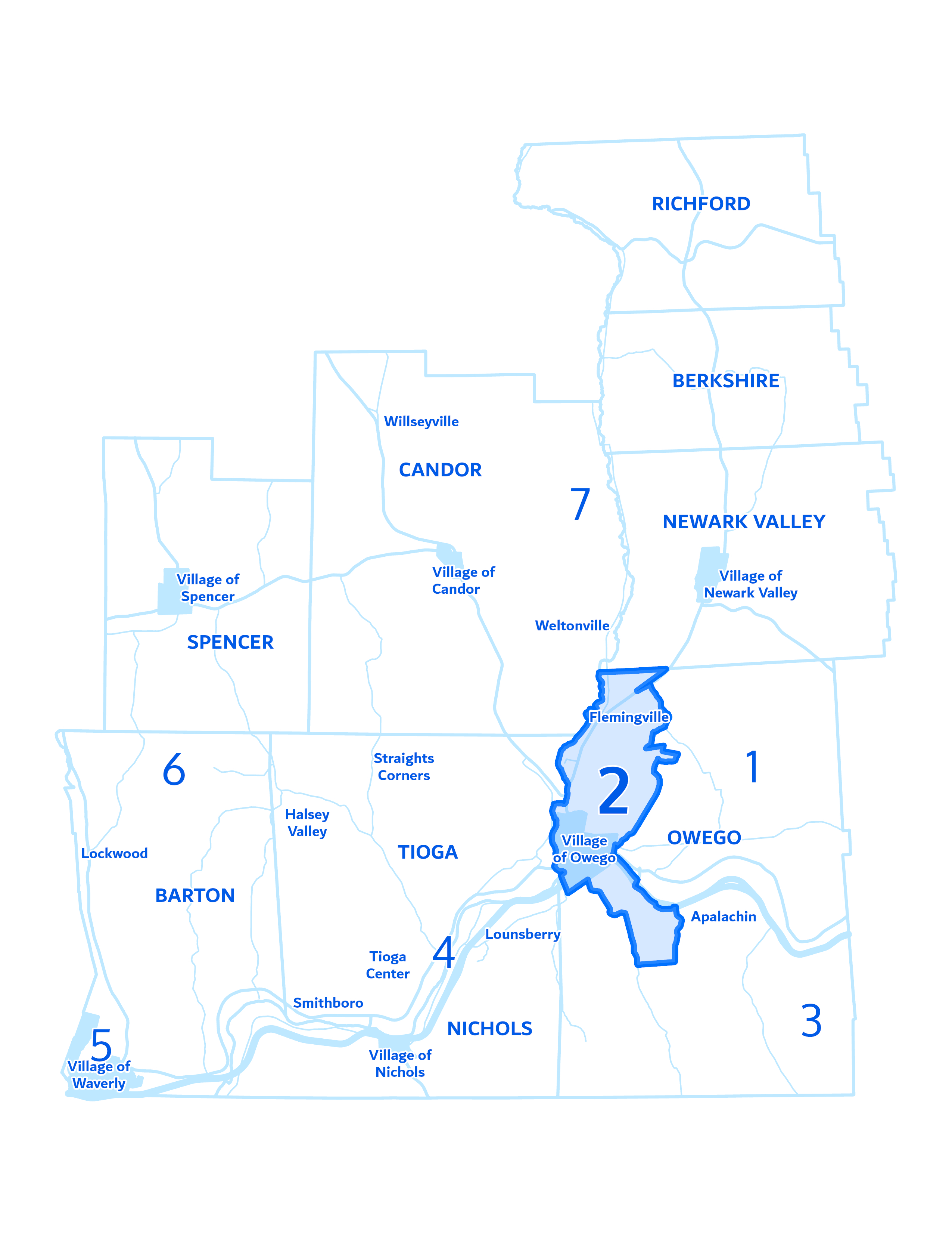 Tioga County is divided into seven legislative districts. Two of those districts, 4 and 7, elect two legislators. The boundaries and configuration of the districts are updated after each decennial census. This general map shows the overview of all 7 districts. Please note that while this map is accurate it is not suitable for precise location of district boundaries due to its small size. To find that information, you may look up the legislative district of any address in Tioga County by using the GIS web app.