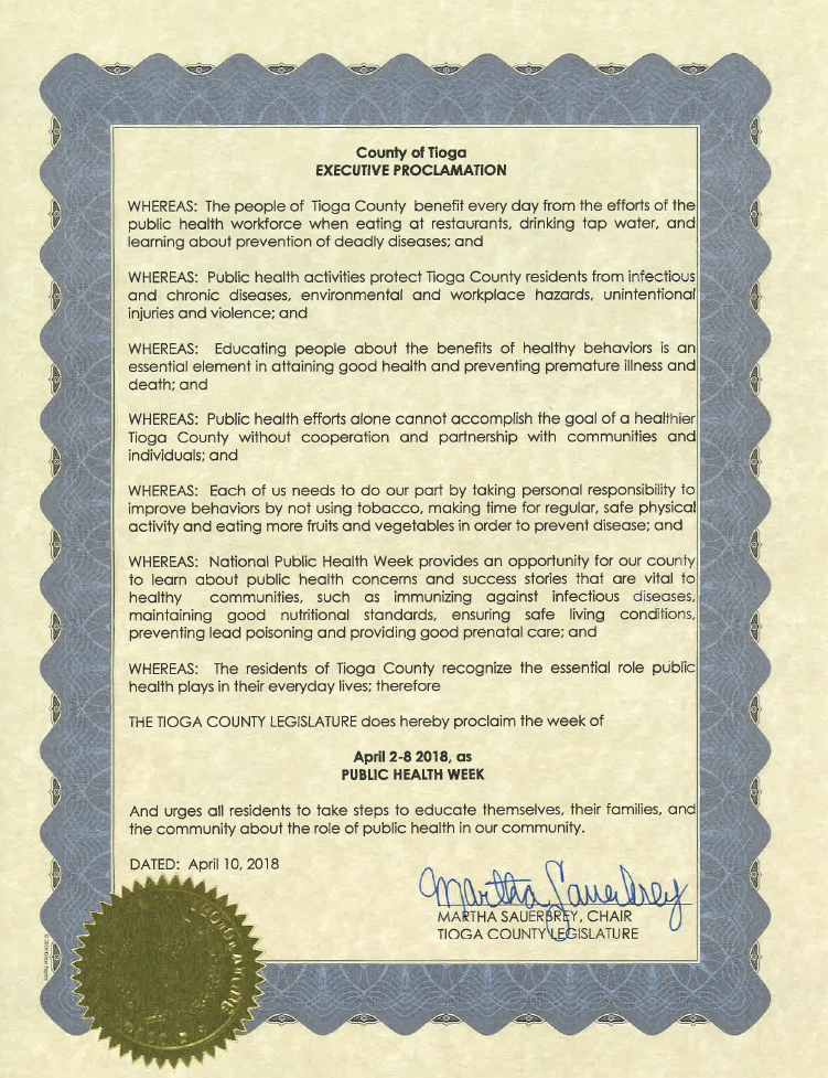 Tioga County Public Health’s mission is to protect and promote the health and well-being of our community through advocacy, education, enforcement, prevention and partnerships. In striving to provide the Ten Essential Services of Public Health, we aim to serve as the public health leader to ensure the needs of our community are met through an integrated and coordinated network of resources that empower people to improve their quality of life. Tioga County Public Health supports the citizens of the County through Environmental Health, Dental Health, Disease Control, Nursing Services, Children's Services, Emergency Preparedness and Health Education programs.
