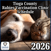 The Environmental Health Division is responsible for rabies control in Tioga County. They investigate exposures and offer preventative vaccinations to pets through rabies vaccination clinics scheduled throughout the year.